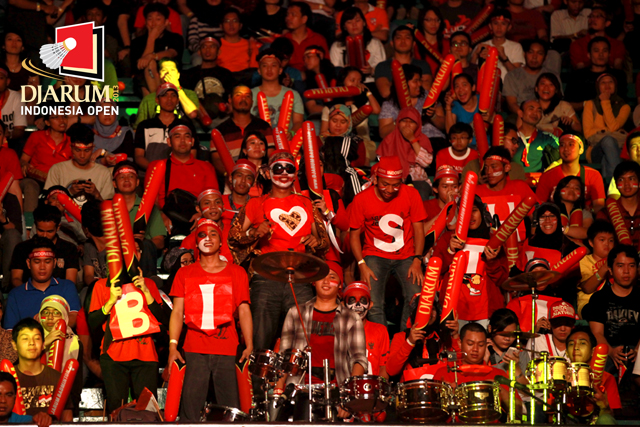 Salah satu suporter fanatik bulutangkis Indonesia terlihat siap dengan atributnya untuk mendukung para atlet tuan rumah.