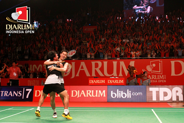 Ekspresi dan selebrasi Mohammad Ahsan/Hendra Setiawan (Indonesia) setelah berhasil memastikan diri sebagai juara usai mengalahkan Ko Sung Hyun/Lee Yong Dae (Korea Selatan) di final Djarum Indonesia Open Super Series Premier 2013.