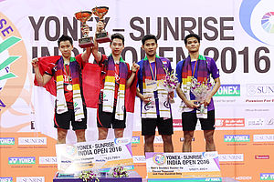 NEW DELHI - "Perang" saudara antara Angga Pratama/Ricky Karanda Suwardi dan Kevin Sanjaya Sukamuljo/Gideon Marcus Fernaldi di babak final India Open...