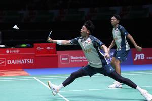 Yokohama | Ganda putra Indonesia Muhammad Shohibul Fikri/Daniel Marthin menggunakan kesempatan latihan terakhir di Yokohama Arena, Yokohama, Jepang,...