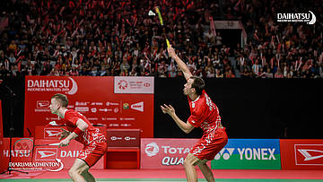Marcus Fernaldi GIDEON/Kevin Sanjaya SUKAMULJO (Indonesia) bersiap melepaskan serangan