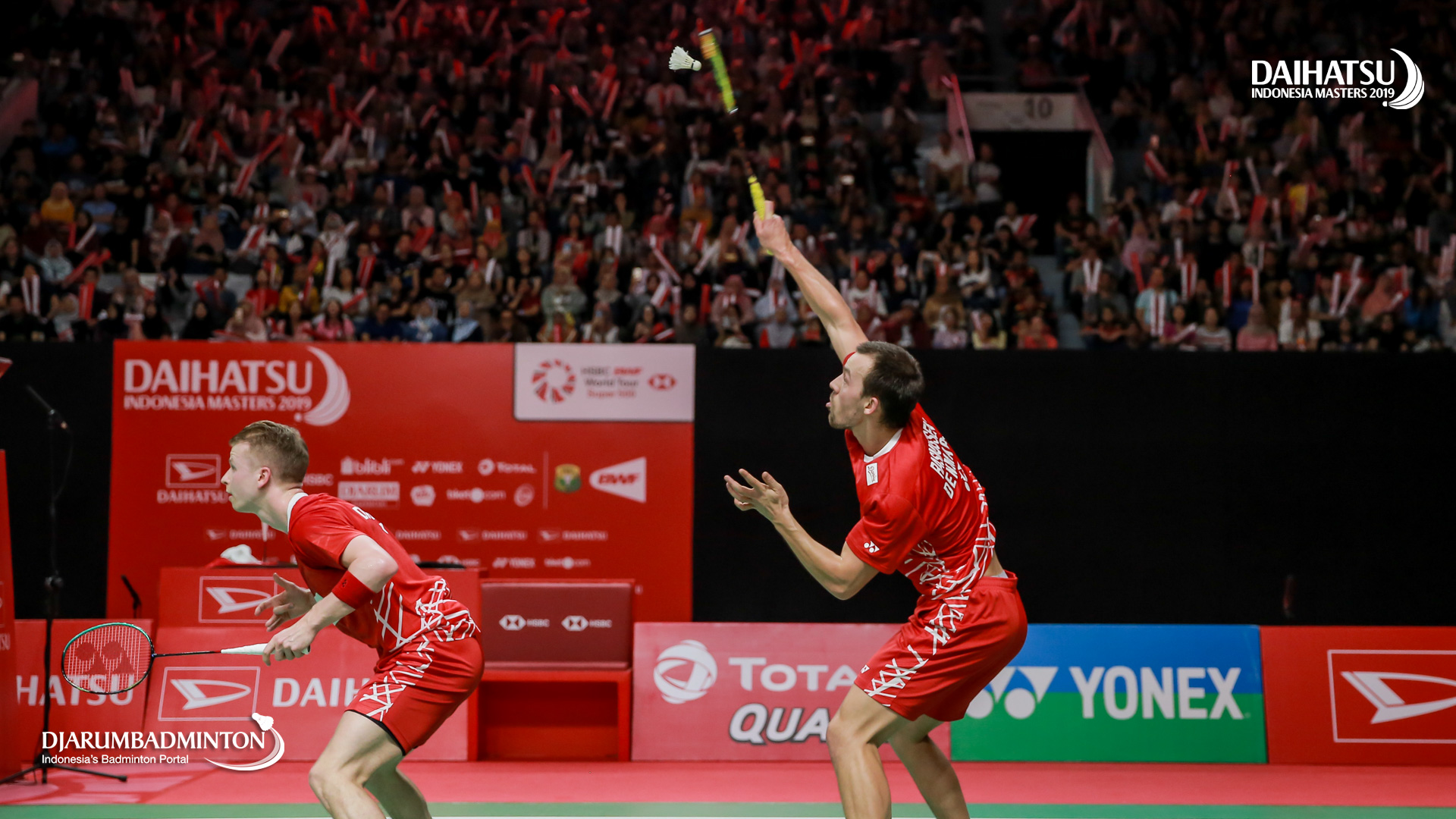 Kim ASTRUP/Anders Skaarup RASMUSSEN (Denmark) bersiap melepaskan serangan