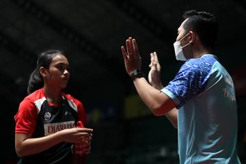Tunggal putri U-17 Shandy Tirani Mahesi (PB Djarum Kudus) dan pelatih PB Djarum Kudus Engga Setiawan