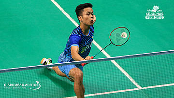 Anthony Sinisuka Ginting (SGS PLN Bandung) Berusaha menggapai shuttlecock