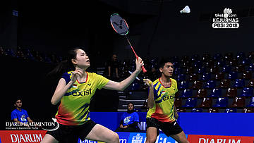 Alfian Eko Prasetya+Della Destiara Haris (Jaya Raya Jakarta) Mengembalikan shuttlecock