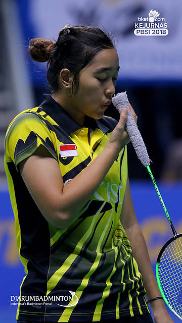 Tsavanne Bethalia Putri Mertoso (DKI Jakarta) Meniup tangannya sebelum menerima serve