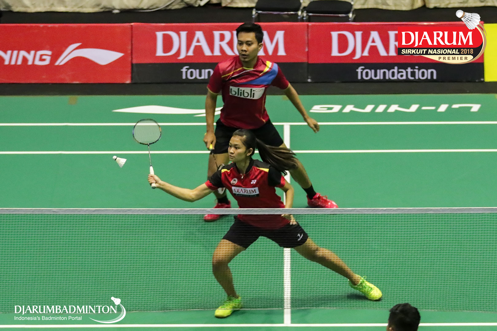 Nugroho Andi Saputro dan Tiara Rosalia Nuraidah (Halim, Jakut+Mutiara Cardinal, Bandung) mengembalikan shuttlecock