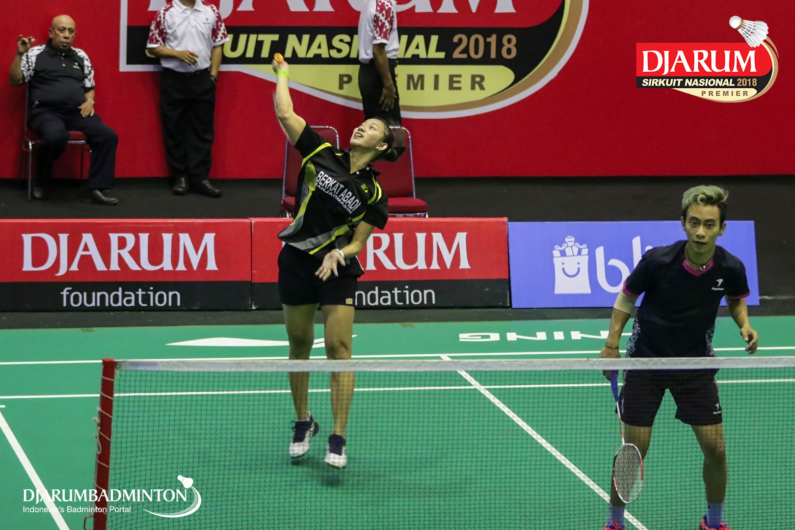 Agripina Primarahmanto Putera dan Devi Tika Permatasari (Berkat Abadi, Banjar) bersiap menyambut shuttlecock