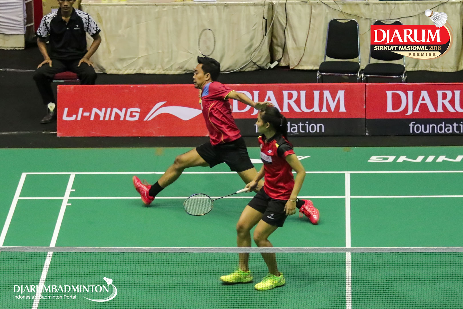 M. Robby Darwis dan Rahmadhani Hastiyanti Putri (Sangkuriang Graha Sarana PLN Bandung+PB Djarum, Kudus) berusaha mengembalikan shuttlecock