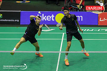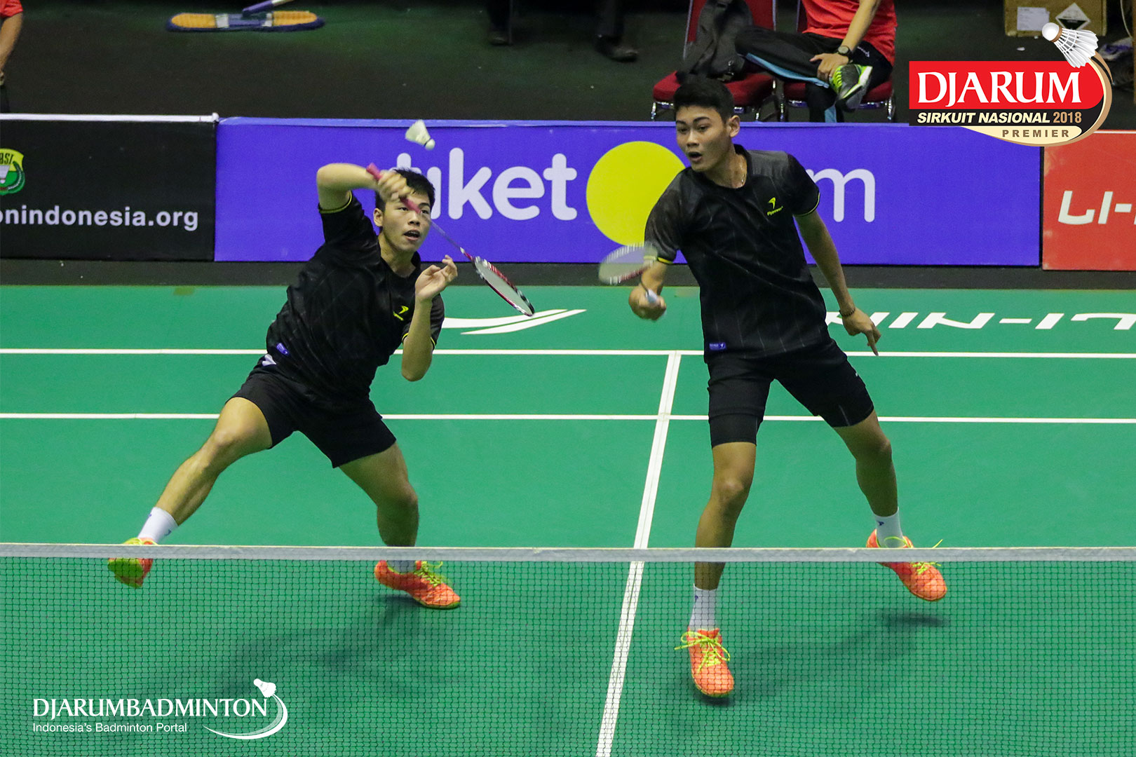 Bryan Sydney Elohim dan Joshua David Wardana (Tangkas Intiland, Jaksel) berusaha mengembalikan shuttlecock