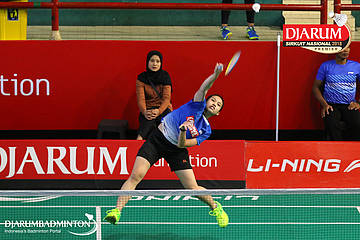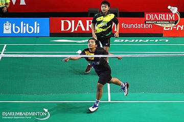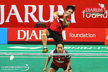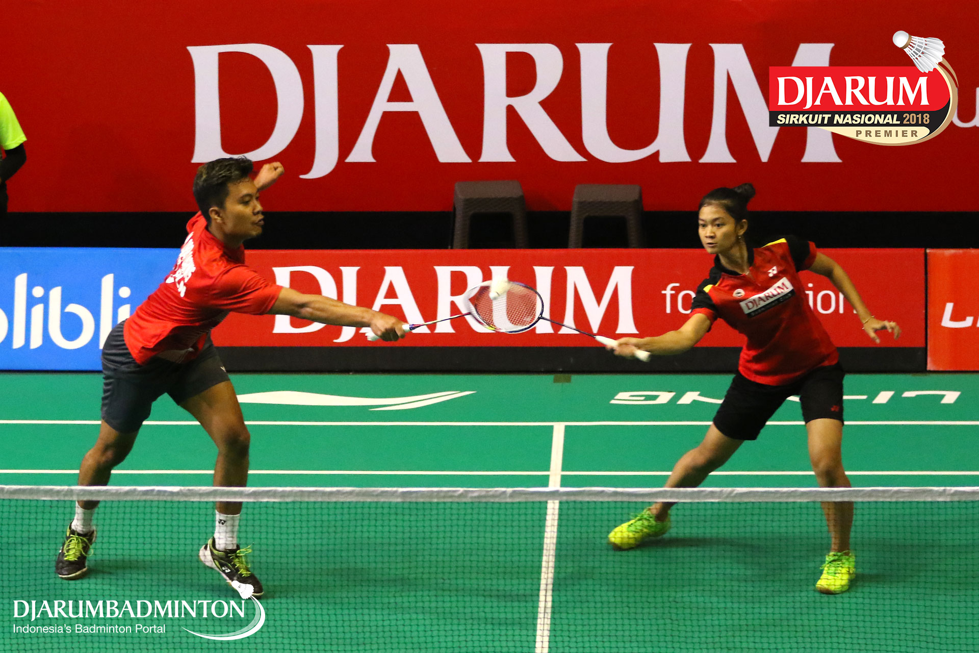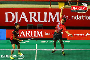 Andrei Adistia/Maria Febe Kusumastuti (PB Djarum, Kudus) menyambar shuttlecock