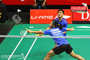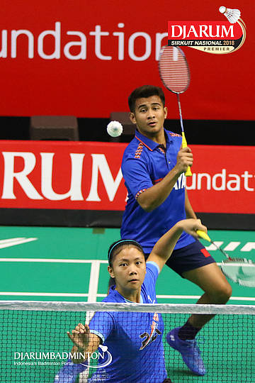 Muhammad Fachrikar Adma Parlindungan Man/Brigita Marcelia Rumambi (Jaya Raya Jakarta, Jakpus/Berkat Abadi, Banjar) menyambar shuttlecock