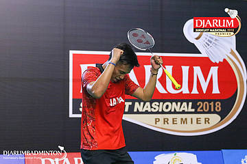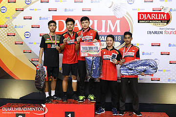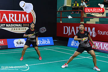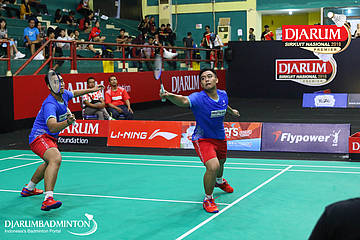 M. Lucky Andres Apriyanda+Respati Banuaji (PB Djarum, Kudus) mengembalikan shuttlecock