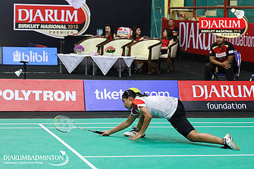 Komang Ayu Cahya Dewi (PB Djarum, Kudus) berusaha mengembalikan shuttlecock