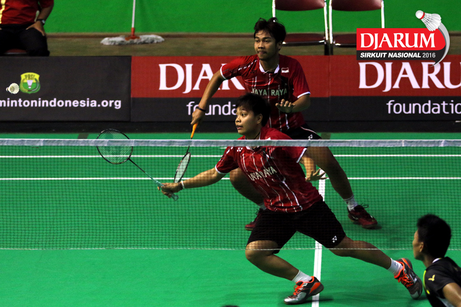 Devand Riefky/Apriyani Rahayu (Jaya Raya) berusaha menggapai shuttlecock
