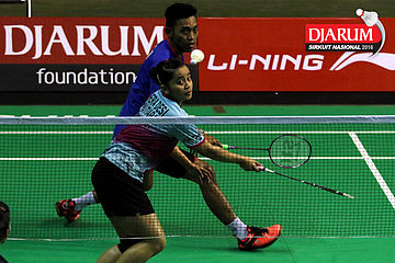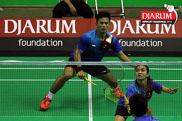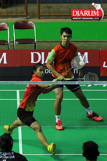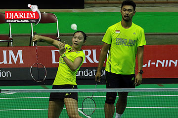 Nugroho Andi/Gebby Ristiyani (Halim/Mutiara Cardinal) menyambar pengembalian tanggung