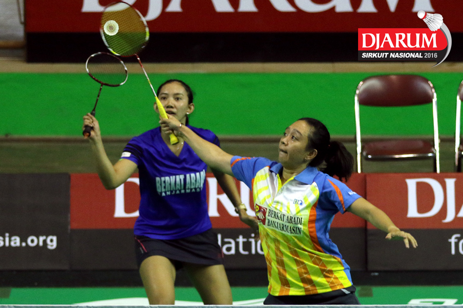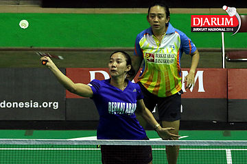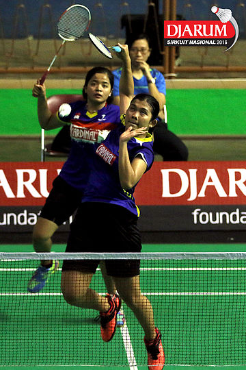 Gebby Ristiyani/Weni Anggraeni (Mutiara Cardinal/Jaya Raya) mengembalikan shuttecock