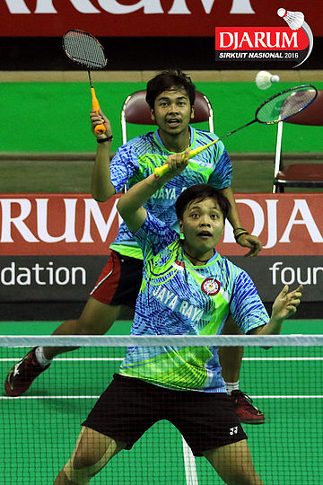 Tedi SUpriadi/Ririn Amelia (Djarum Kudus) bersiap menyambar pengembalian