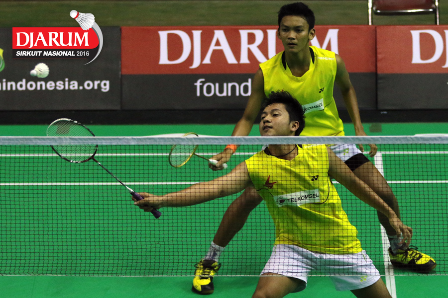 Abiyyu Fauzan/M. Shohibul Fikri (Pusdiklat Telkom) mengembalikan shuttlecock