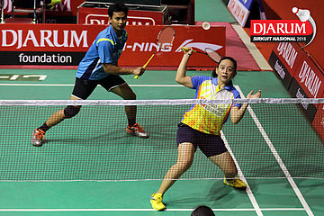 Didit Juang/Keshya Nurvita (Trikus Badminton/Berkat Abadi) Mengembalikan Shuttlecock.