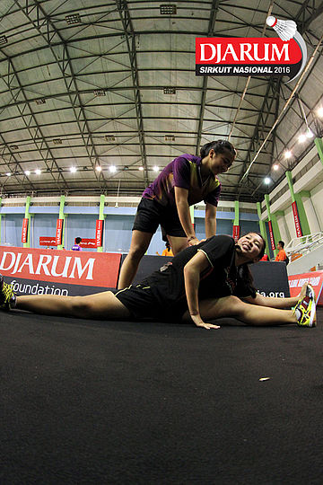 Ni Made Pranita dan Made Deya Surya saat melakukan stretching.