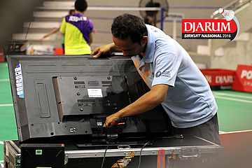 Salah seorang pekerja saat memasang perangkat Live Score.