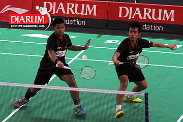 Helmi Abbu/Rehan Naufal (Djarum Kudus) mengembalikan shuttlecock