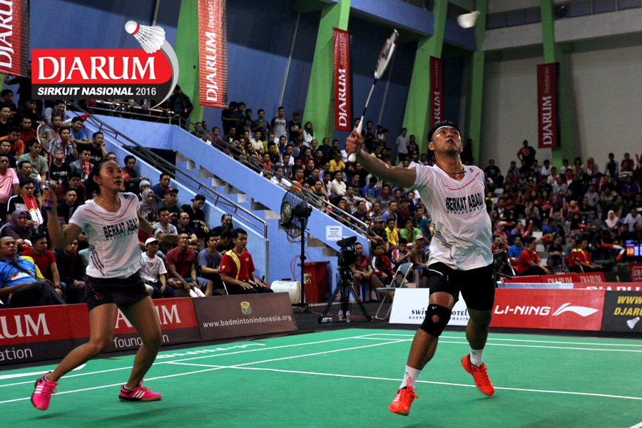 Irfan Fadhilla/Weni Anggraeni (Jaya Raya) mengembalikan shuttlecock