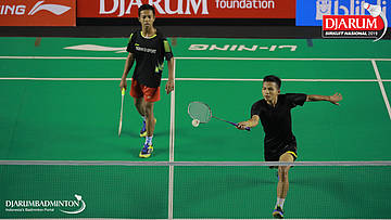 Jery Saputra+Muhammad Aini Toyyib (H2B KALSEL) bersiap menyambut shuttlecock