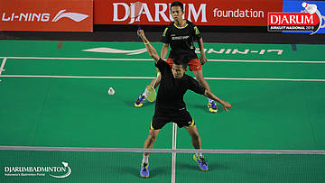 Muhammad Andrian+Muhammad Nauval (PB SGS PLN Taufik Hidayat Arena, Jaktim+Khuripan Jaya) menyambar serangan