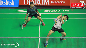 Muhammad Hanif Abdillah+Muhammad Ihsan Abdilah (Polyban, Banjarmasin) bersiap menyambar shuttlecock