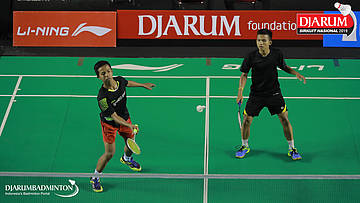 Achmad Reza Anauval+Ammar Miqdad Muafi (Sentra, Banjarmasin) bersiap menyambut shuttlecock