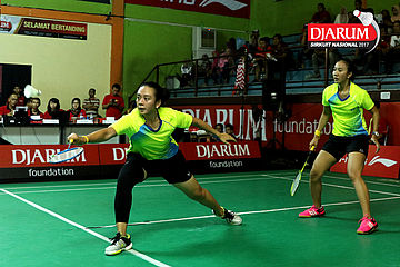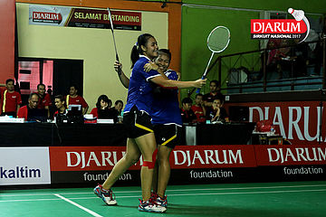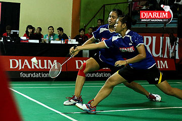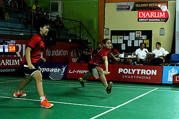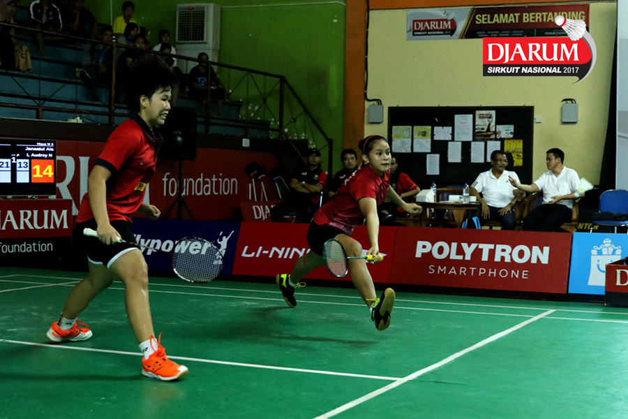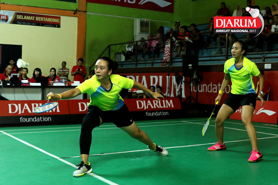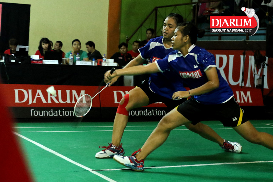 Devi Tika P/Keshya Nurvita H (Berkat Abadi Banjarmasin) Mengembalikan shuttlecock Ke Arah Lawan