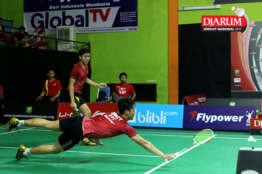 M Yusuf Maulana/Yonathan Ramlie (Mentari RBT) Berusaha Menggapai Shuttlecock