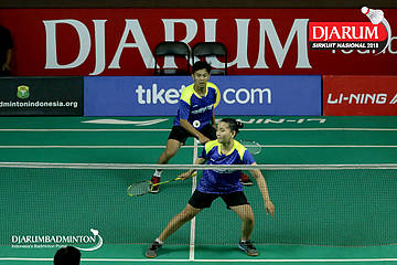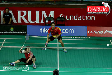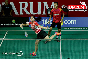 Imam Nur/Sumarni (Pupuk Kaltim Bontang/Terpadu Balikpapan) bersiap mengembalikna shuttlecock