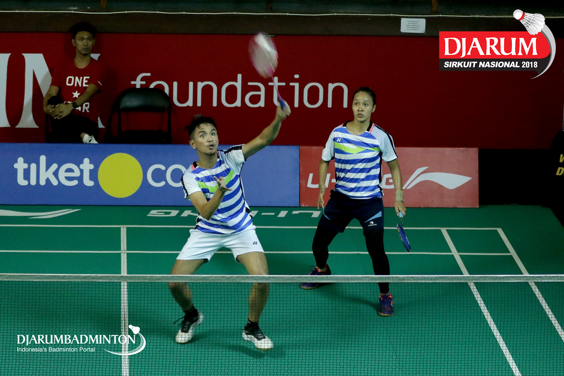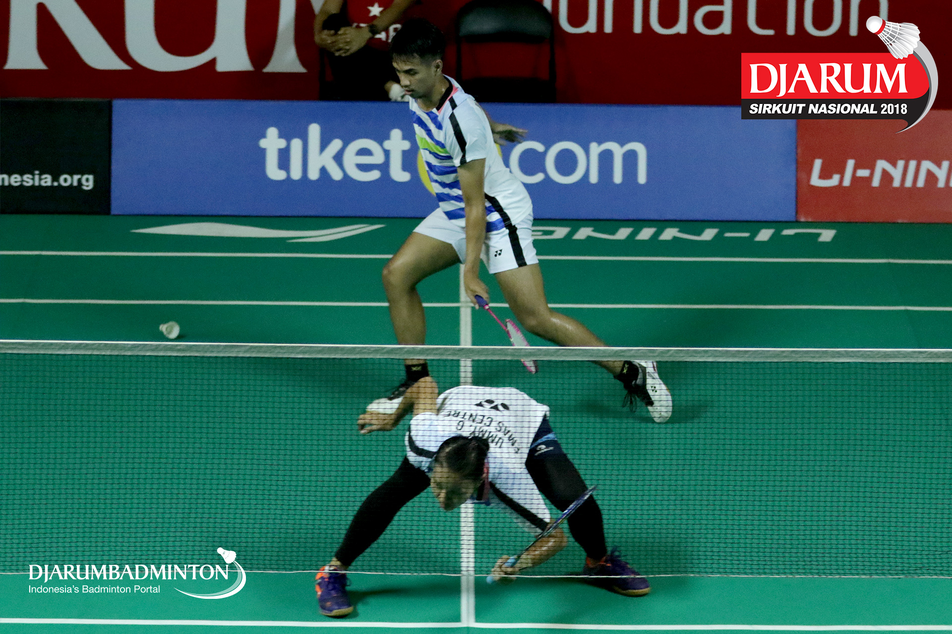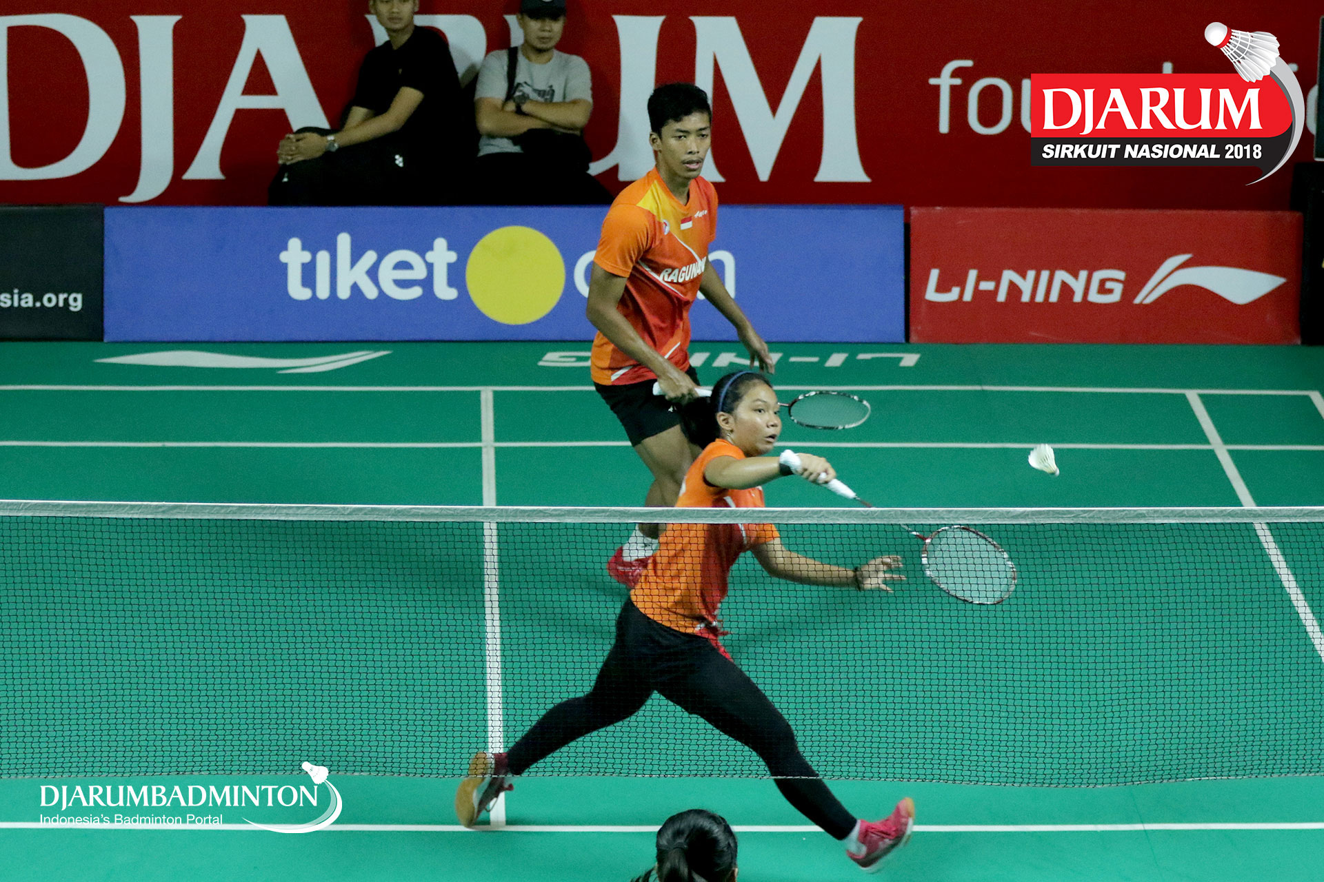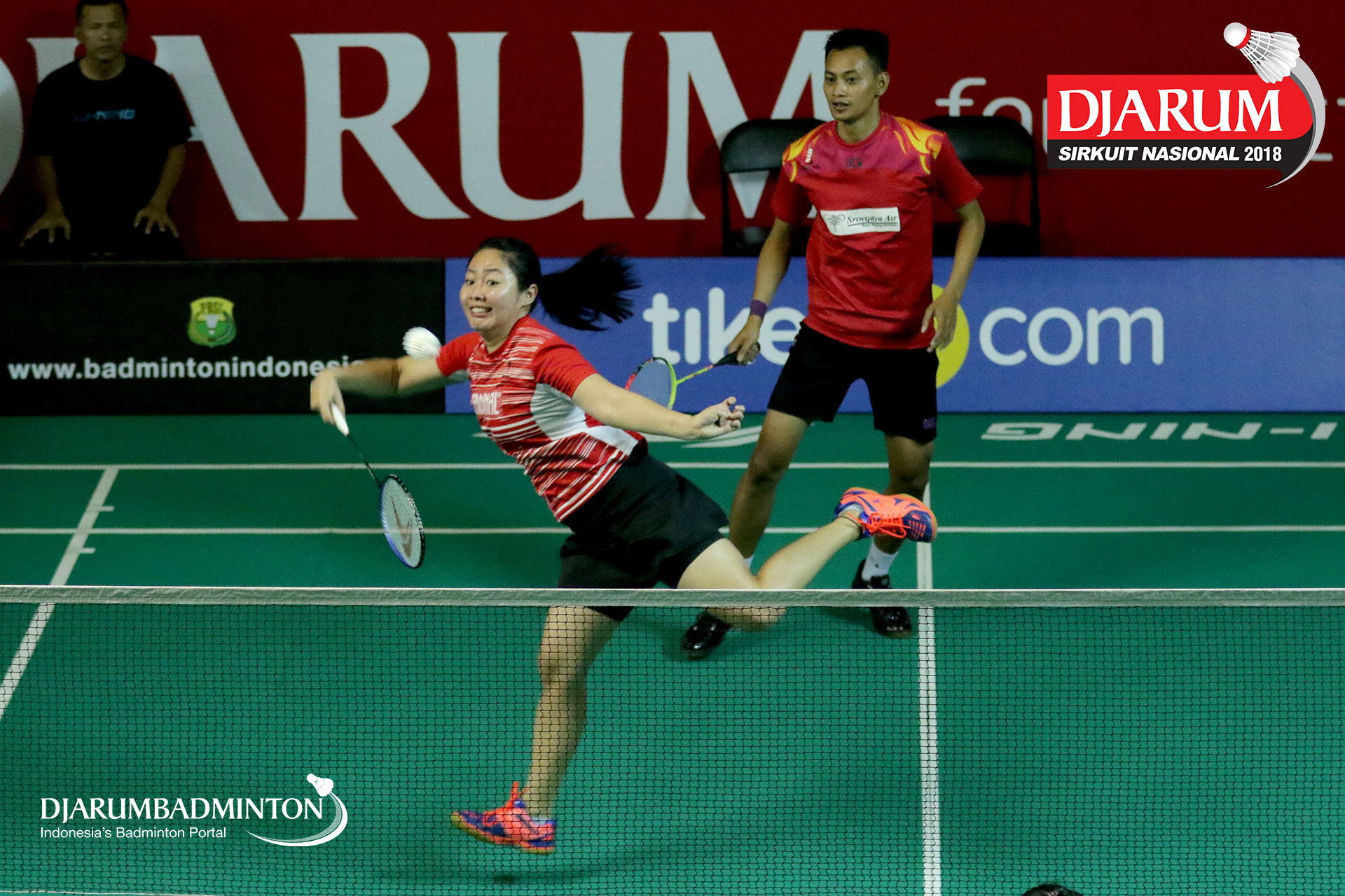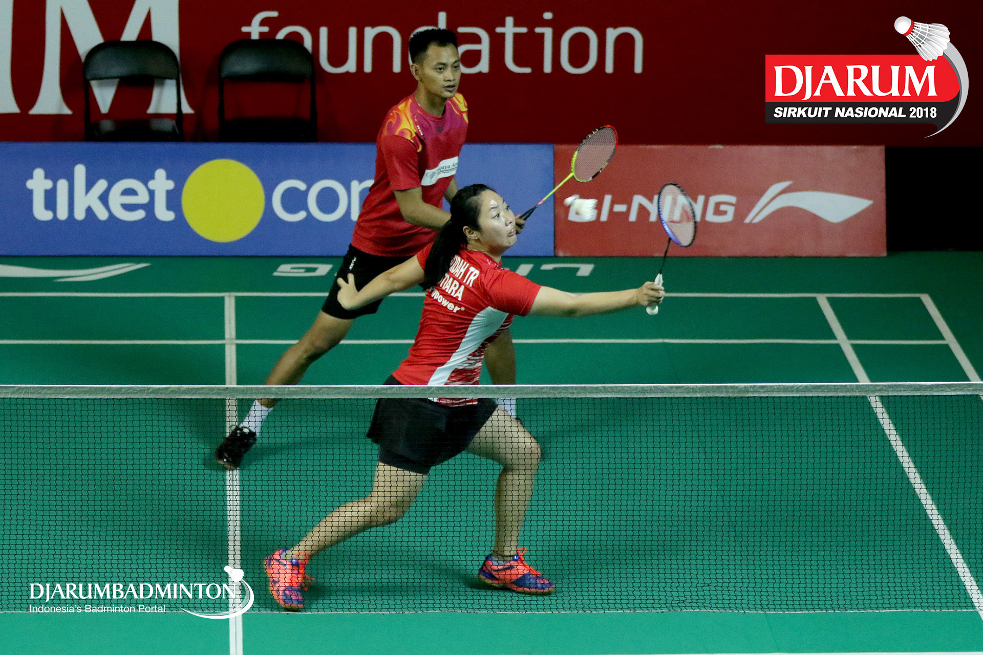 Arya Julius Fernanda/Putri Andini Wahyuningrum (Mutiara Cardinal, Bandung) berusaha membbalikan shuttlecock