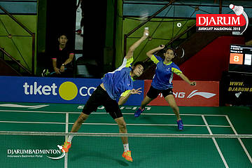 Christoffer Jonathan/Siti Dwi Yanti Datu (Tangkas Intiland, Jaksel/PPLP SULUT) berusaha menyambut shuttlecock