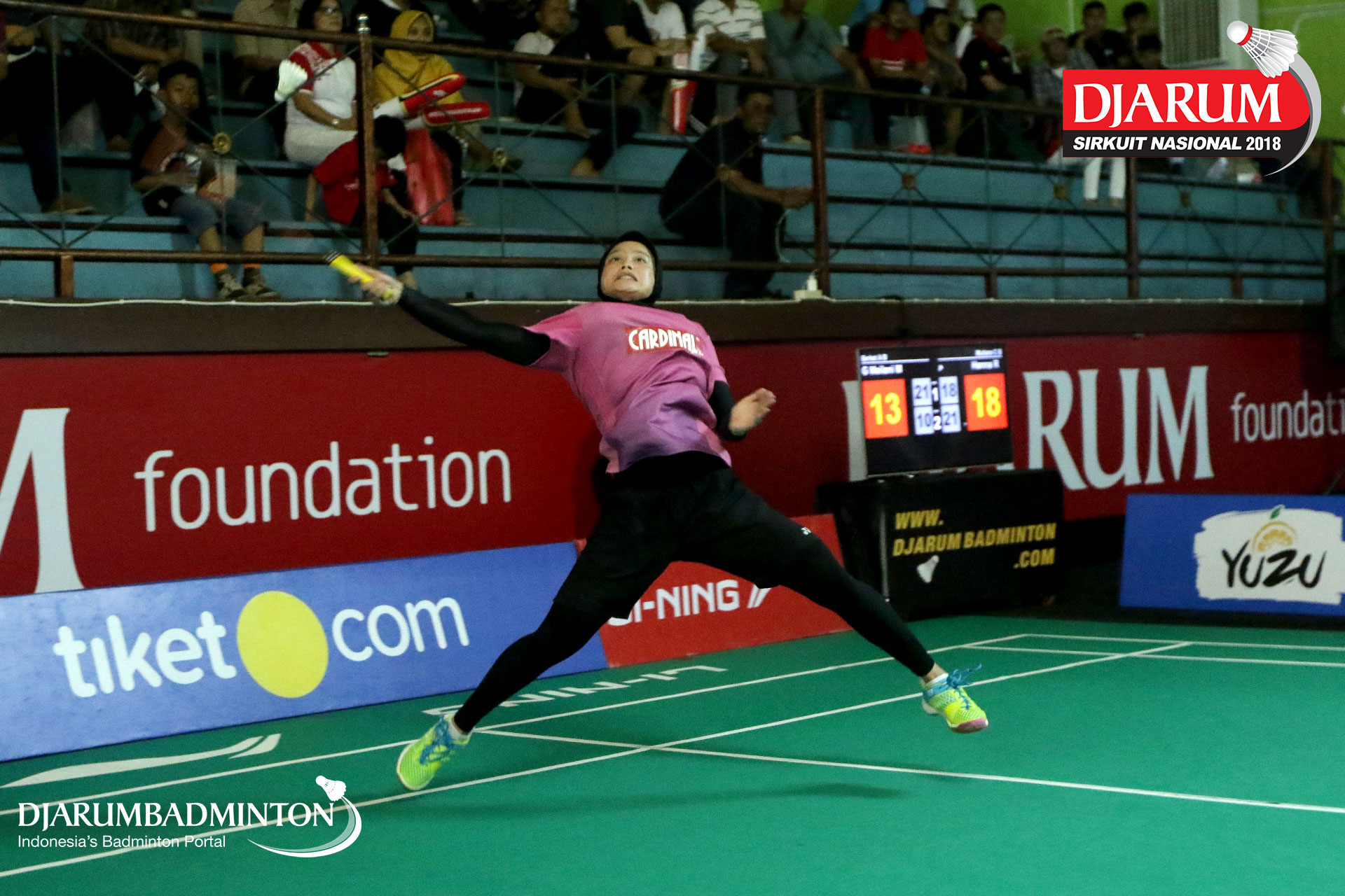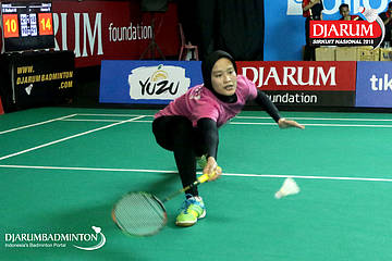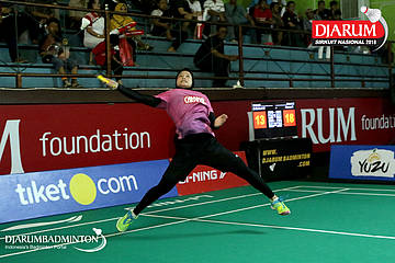 Hanna Ramadini (Mutiara Cardinal, Bandung) berusaha menyambut shuttlecock