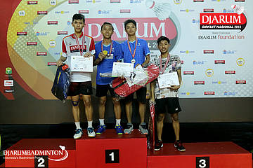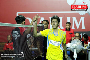 Wisnu Yuli Prasetyo (Pertamina Fastron, Jakut) dan Bagas Kristianto Nugroho (PB Djarum, Kudus) bersalaman seusai bertanding