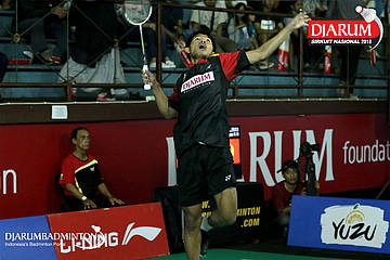 Bagas Kristianto Nugroho (PB Djarum, Kudus) bersiap melakukan smash