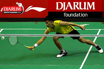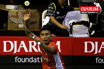 Vero Wisnu (Djarum Kudus) mengembalikan shuttlecock