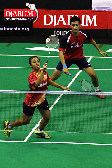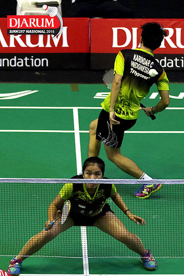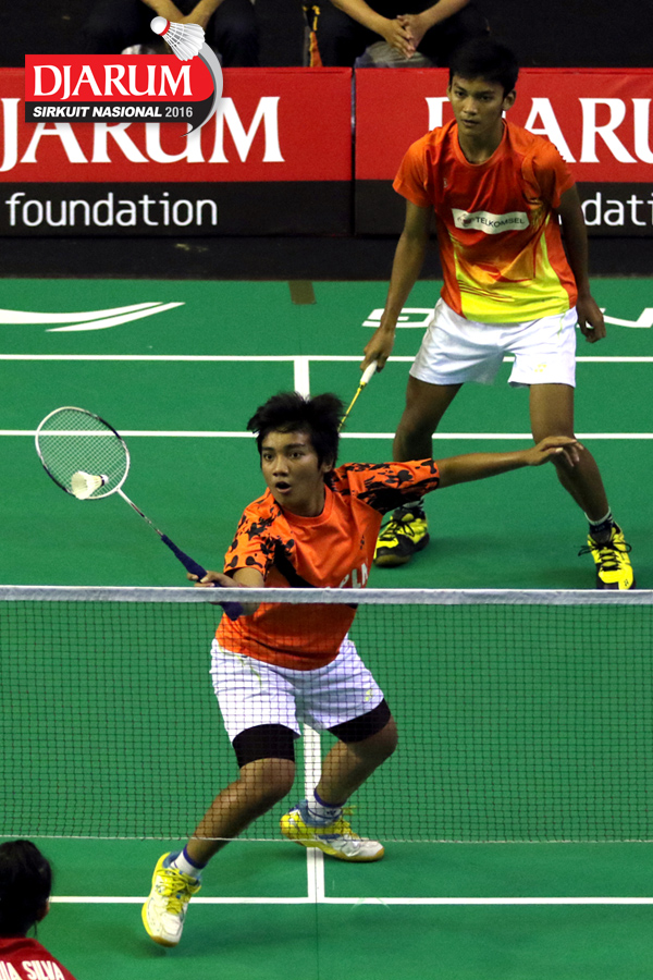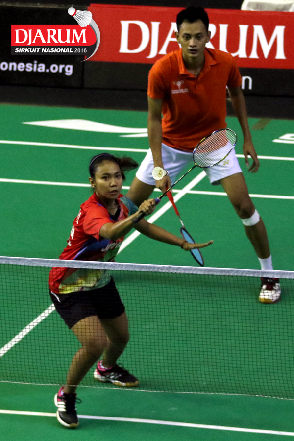Tedi Supriadi/Syifa Fauziah (Djarum Kudus/Jaya Raya) bersiap menyambar pengembalian tanggung
