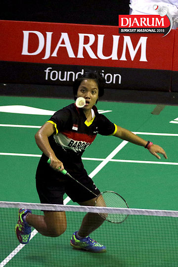 Lukhi Apri/Ririn Amelia (Djarum Kudus) mengembalikan shuttlecock
