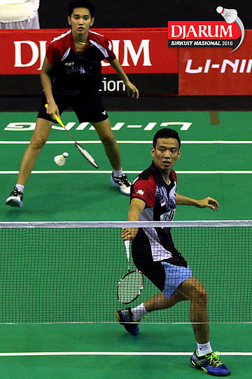 Nugroho Andi/Aris Budiharti (Halim/Jaya Raya) bersiap menyambar pengembalian