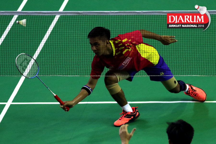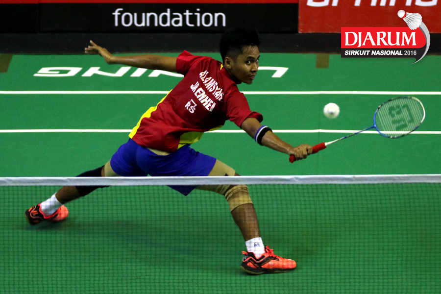 Alamsyah Yunus (JR Enkei) mengembalikan shuttlecock