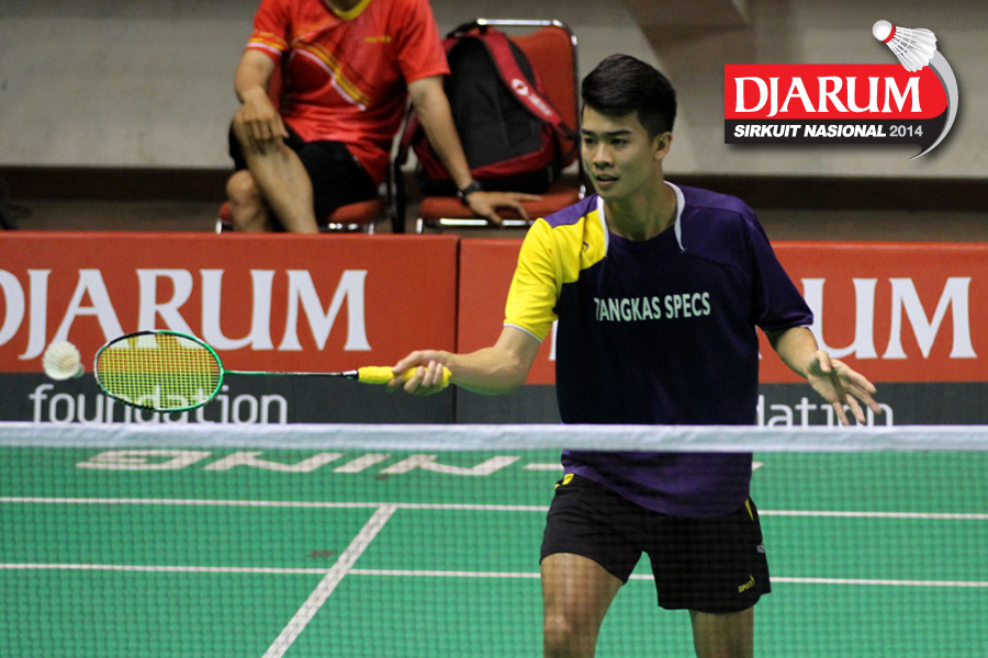 Aulia Febrianto (KUJANG TUNGGAL BOGOR) mengembalikan shuttlecock ke arah I Putu Roy Danu (SEMEN GRESIK)
