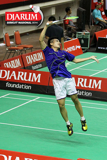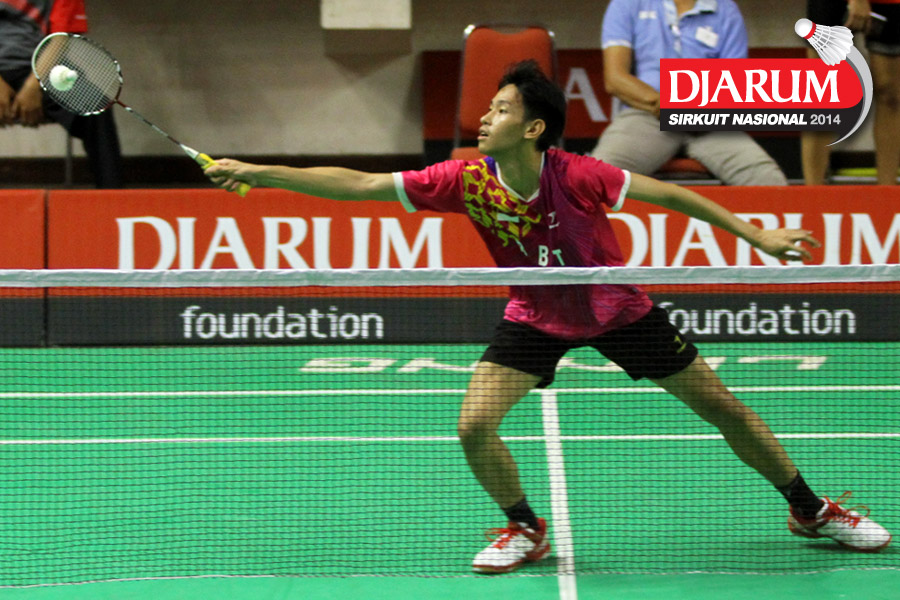 Endru Tampi (TANGKAS JAKARTA) mencoba menggapai shuttlecock