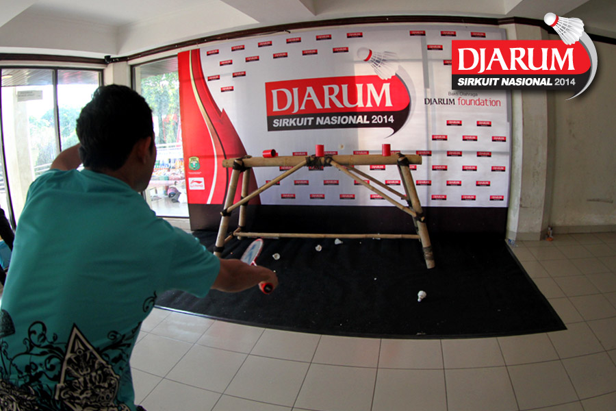 Seorang pengunjung sedang mencoba games yang di tersedia di dalam GOR Lila Bhuana