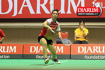 Devi Yunita Indah Sari (DJARUM KUDUS) mengembalikan shuttlecock ke arah Mia Mawarti Utami (GUNA DHARMA)