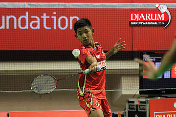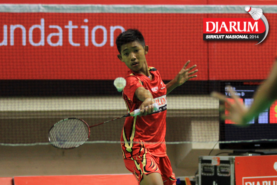 Bagas Kristianto Nugroho (DJARUM KUDUS) mengembalikan shuttlecock ke arahTri Haryanto (EXIST JAKARTA)